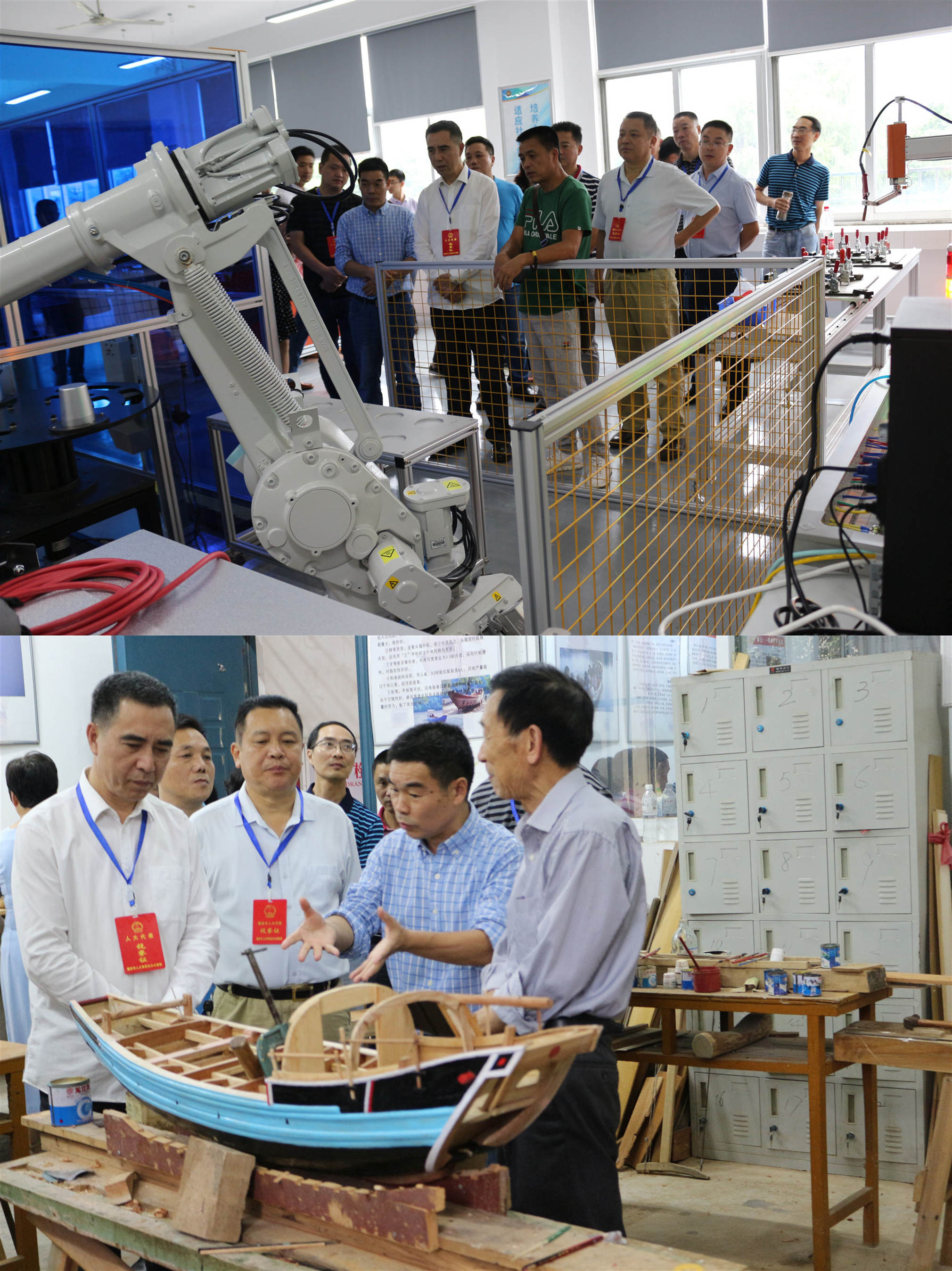 在参观学校数车实训室,船模实训室,汽车实训室,电工实训室,智能制造中心等实训室中,郑战雄主任一行边参观边仔细听取李校长就学校特色学科专业建设情况介绍。在参观中,市领导每到一个实训室,都要向实训室教师了解该实训室的建设情况,并饶有兴致地听取对设备功能及流程的介绍。