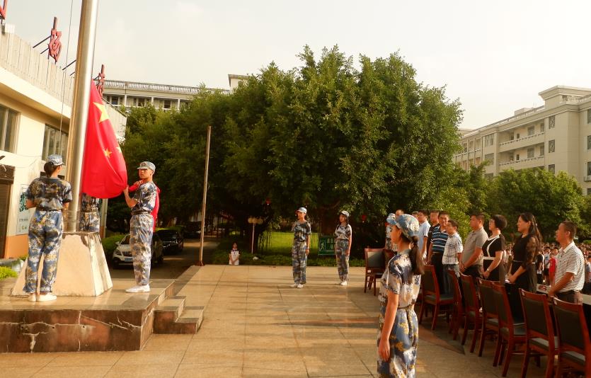 随后,进行开学典礼的第一个环节:升旗仪式。全体师生立正,面向国旗,行注目礼,五星红旗在庄严的国歌声中冉冉升起。