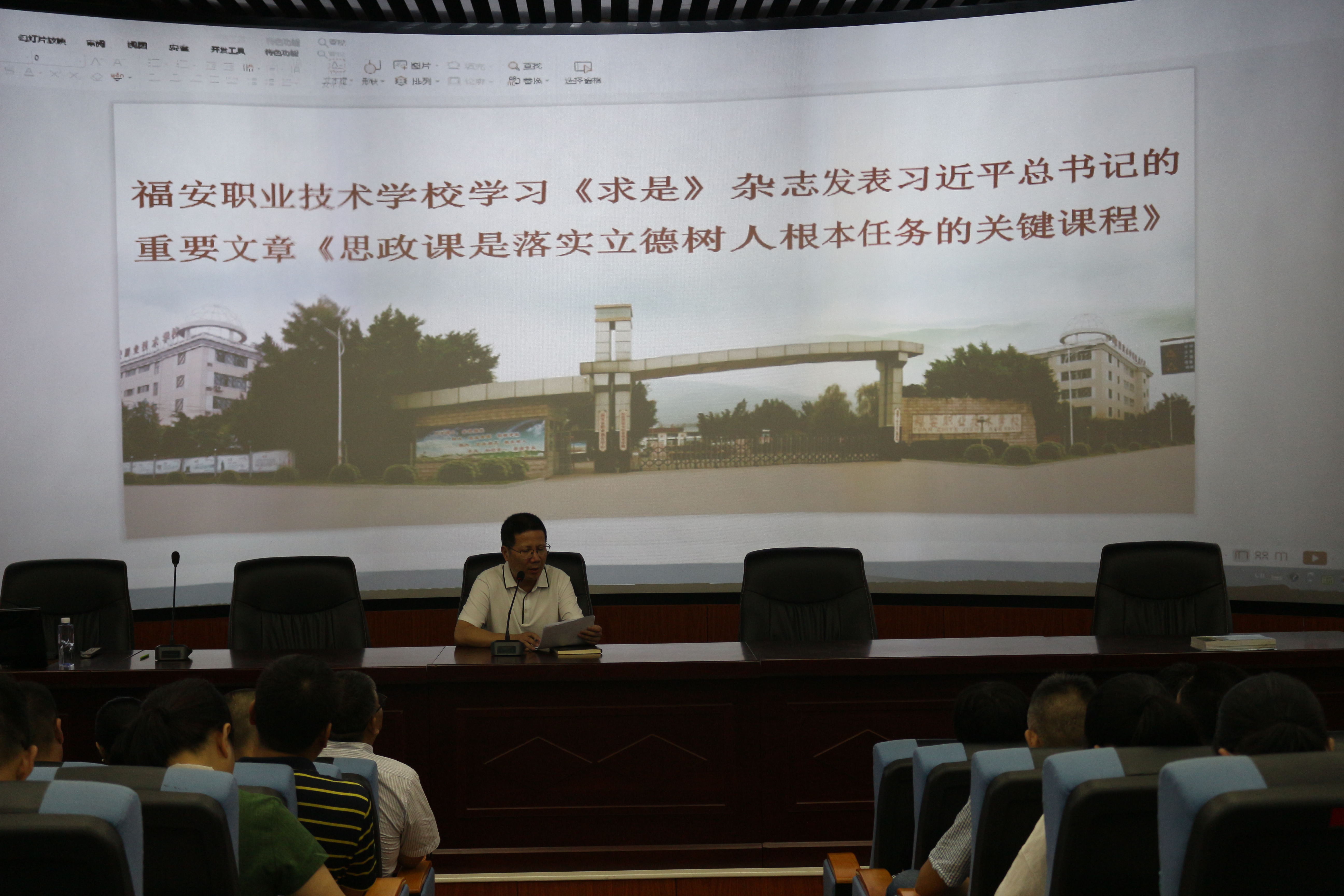 为了全面贯彻党的教育方针,解决好培养什么人、怎样培养人、为谁培养人这个根本问题,落实好立德树人的根本任务,9月11日下午,在教学楼3D旅游实训室,福安职业技术学校全体教师深入学习《求是》杂志发表习总书记的重要文章《思政课是落实立德树人根本任务的关键课程》。