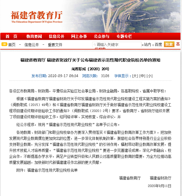 9月11日,福建省教育厅、财政厅联合下发《关于公布福建省示范性现代职业院校名单的通知》,福建省福安职业技术学校被确认为福建省示范性现代中等职业学校。