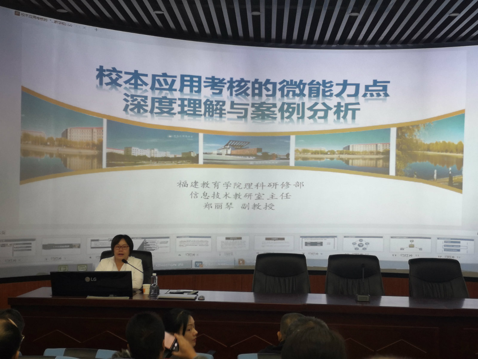 紧接着,福建教育学院郑丽琴副教授给全体教师作了《校本应用考核的微能力点深度理解与案例分析》的专题讲座,从2.0工程的理解、整校推进的实施路径和微能力的解读与案例分析等三个方面进行讲解,突出微能力点如何在学情分析、课件制作和课堂教学等几个维度进行实施和落地,并引领参训教师进行实际操作。