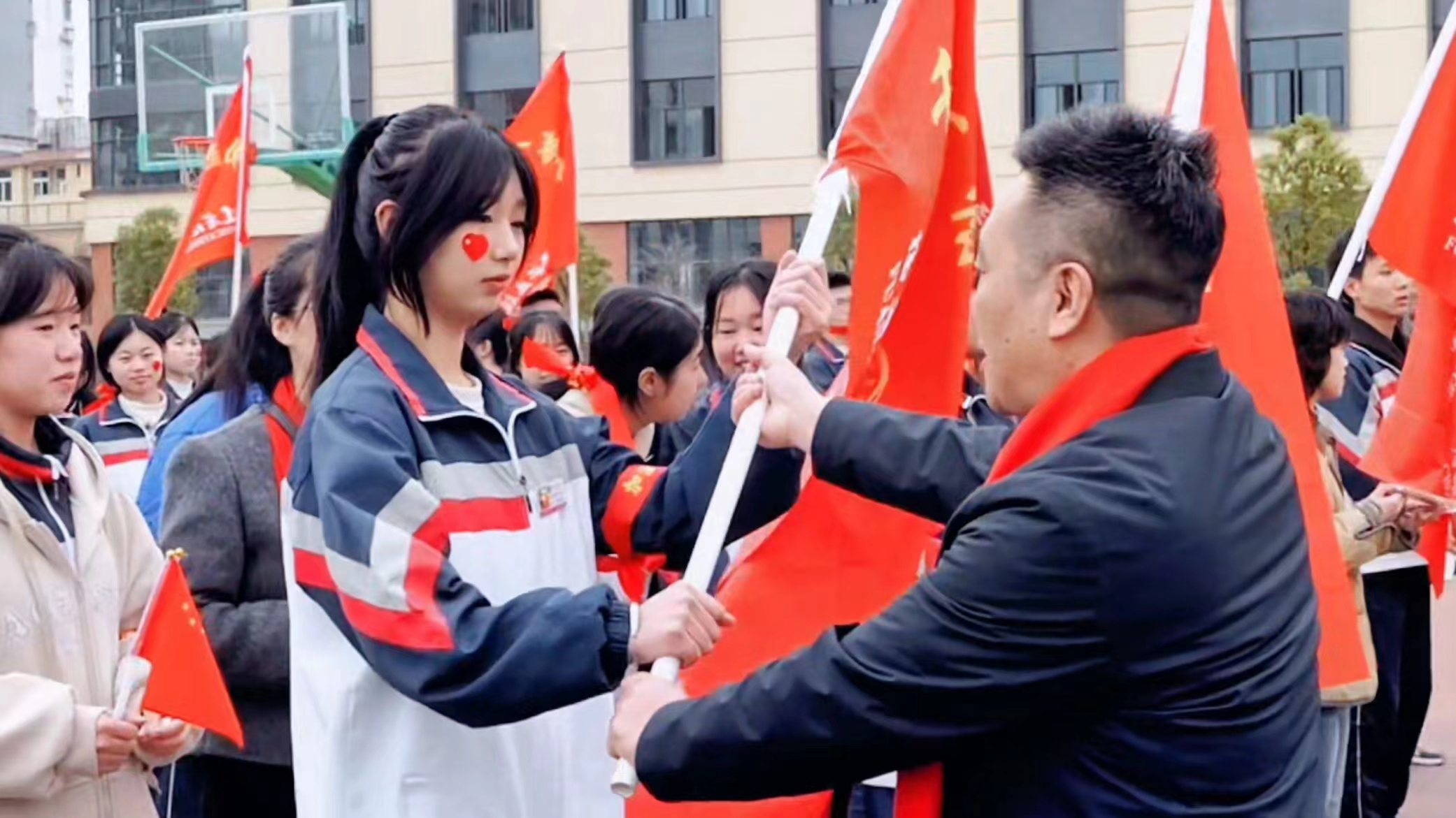 授旗仪式上,黄小刚书记和曾柳娟校长为各班授旗,将使命与荣耀传递至各班,用旗帜谱写学考雄壮的凯歌。