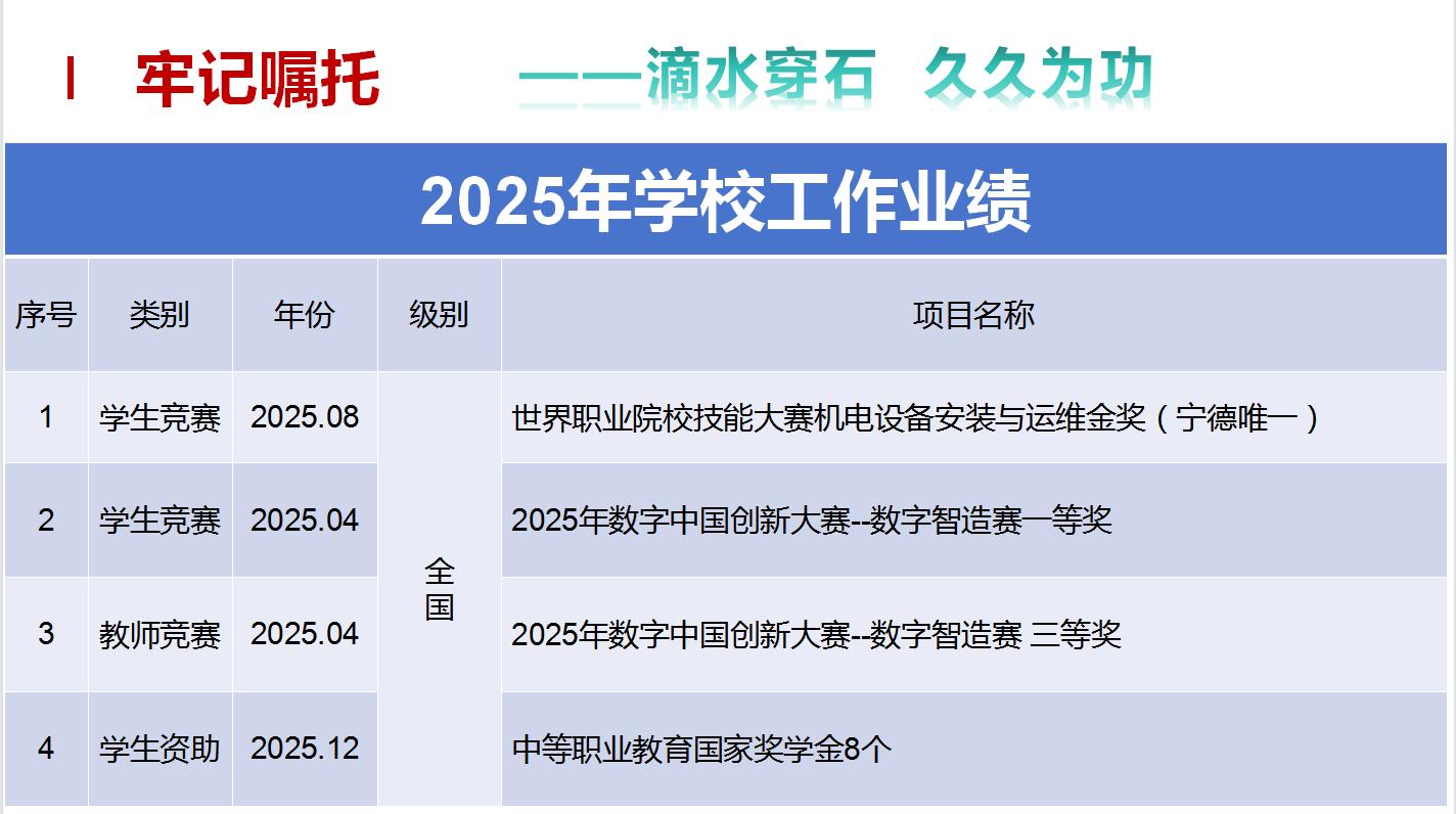 校长曾柳娟代表学校作 2025 年度工作总结讲话,她首先向全体教职工的辛勤付出致以诚挚感谢。她指出,2025 年是学校 “十四五” 规划收官的关键之年,更是向国家级优质中职学校迈进的实干之年。这一年,学校在党建引领下斩获多项荣誉,成为首批福建省中等职业学校 “三全育人” 典型学校,“一核五径・三全贯通” 育人模式入选省级典型案例;教学提质成效显著,机电技术应用高水平专业群完成建设成果上报,新能源汽车智能网联产教融合实训基地顺利建成,22 级高职分类考试 1010 人全部上线、11 人成功考入本科院校;师生竞赛捷报频传,不仅在世界职业院校技能大赛 “机电设备安装与运维” 赛道(中职组)首夺金奖,实现宁德市该领域历史性突破,还累计获得各级奖项 172 个,其中教师奖项 48 个 93 人、学生奖项 112 个 218 人,彰显了学校 “崇德强能” 的办学理念。