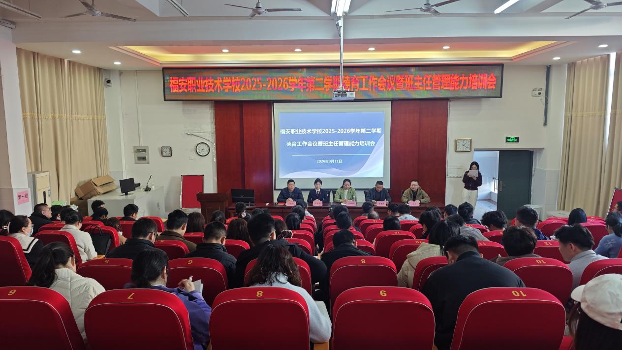 为明确新学期德育工作目标,统一思想,部署任务,福建省福安职业技术学校于2026年3月11日下午,在教学楼3D旅游实训室顺利召开2025-2026学年第二学期德育工作会议暨班主任管理能力培训会。本次会议由德育分管领导林建书主持,校长曾柳娟、法治副校长陈榕榕、政教处、年段长、全体班主任,以及相关德育工作人员参加了本次会议。