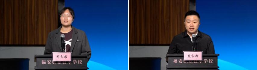 企业代表宁德长盈新能源科技有限公司人事经理龚小丹、福安市按摩保健器具行业协会会长陈文玮分别发言。他们分享了与学校的合作经历,介绍了福安按摩器产业发展现状,并表示将继续推动更多企业与学校在订单班、实训基地等方面开展深度合作。