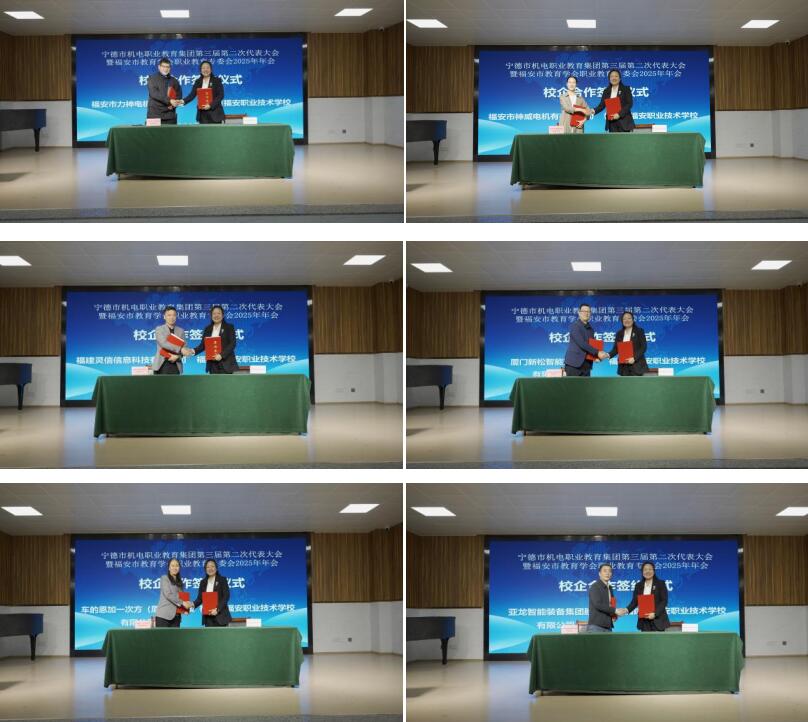 随后,会上举行了新增校企合作签约仪式。福安职业技术学校与福安市力神电机有限公司、福安市神威电机有限公司、福建灵信信息科技有限公司、厦门新松智能研究院有限公司、车的恩加一次方(厦门)科技有限公司、亚龙智能装备集团股份有限公司等6家企业现场签约。