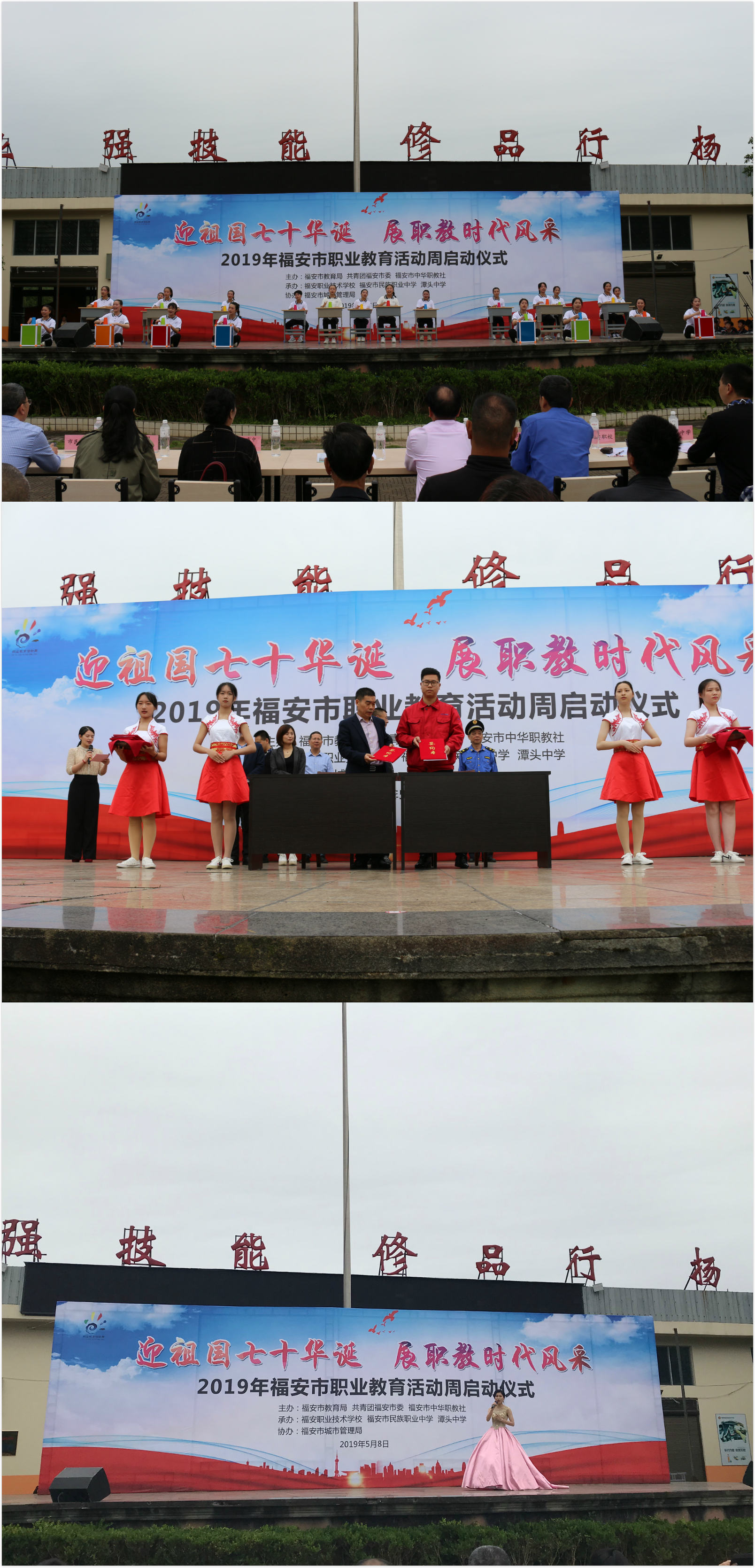 5月8日上午,由福安市教育局、共青团福安市委、福安市中华职教社主办,福安职业技术学校、福安市民族职业中学、潭头中学承办,福安市城市管理局协办的福安市2019年“职业教育活动周”启动仪式在福安职业技术学校隆重举行。今年职业教育活动周的主题是“迎祖国七十华诞,展职教时代风采”。福安市人民政府谢嘉林副市长、福安市中华职教社饶兰芳主任和福安市相关单位领导、福安市中职类学校代表以及福建怡和电子有限公司、宁德市五毛传媒等校企合作企业代表,与福安职业技术学校2000余名师生、家长代表共同参加了本次职教盛会。