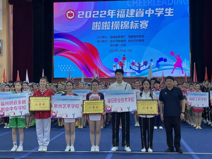 五月的泉州一中开满了蓝花楹,紫色的艳丽和热烈欢迎着全省23支代表队,500多名参赛队员齐聚泉州参加2022年福建省中学生啦啦操锦标赛。经过数次推迟,赛事终于在2023年5月5日在泉州一中(东海校区)拉开帷幕。福安职业技术学校啦啦操队参加了中职组团体赛和两个单项赛的角逐,最终获得团体三等奖、啦啦操街舞二级规定动作第三名和啦啦操校园示范套路第四名三项奖项。