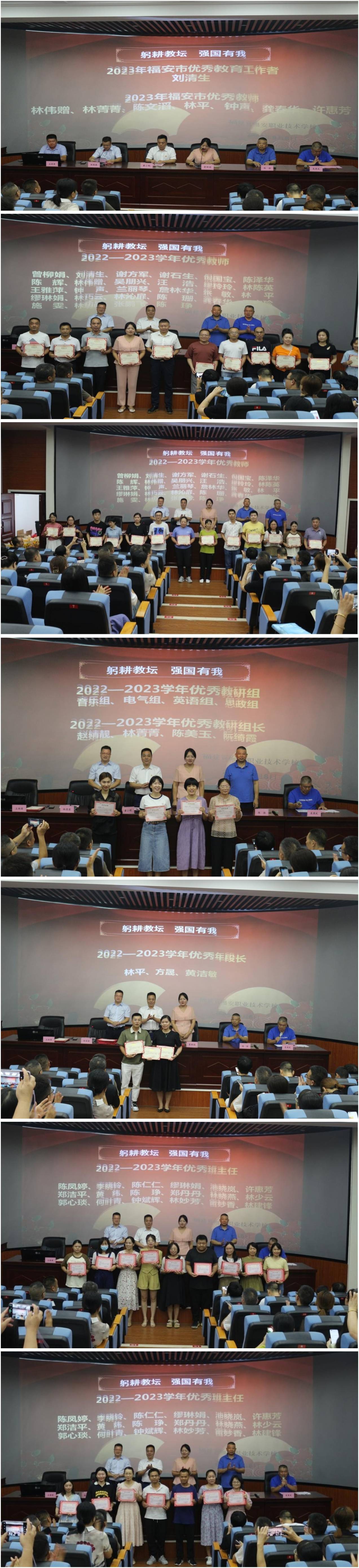 大会上林国梁副校长宣读了2023年我校荣获福安市优秀教育工作者和优秀教师人员,以及2022—2023学年校优秀教师人员。吴国武副书记宣读了2022-2023学年优秀教研组长、优秀年段长、优秀班主任人员。校领导对以上教师进行表彰,并向他们表示热烈的祝贺。