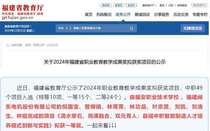 学校科研赋能,助推内涵发展。在年底公布的2024年福建省职业教育教学成果奖拟获奖项目公示中,学校《滴水穿石、岗课融合、双元育人:县域中职智能制造人才培养模式创新与实践》项目荣获福建省职业教育教学成果一等奖。同时,学校成功立项省级课题1个、福安市课题1个,完成宁德市课题结题1个、福安市课题结题6个。教师发表CN论文或论文汇编共计20多篇,在省级职教优秀论文征集评选活动中荣获二等奖3篇,在纪念福建省陶行知研究会成立四十周年征文比赛中荣获三等奖1篇。学校还成功申报福建省课程思政示范项目1个,有效提升了课程建设水平。