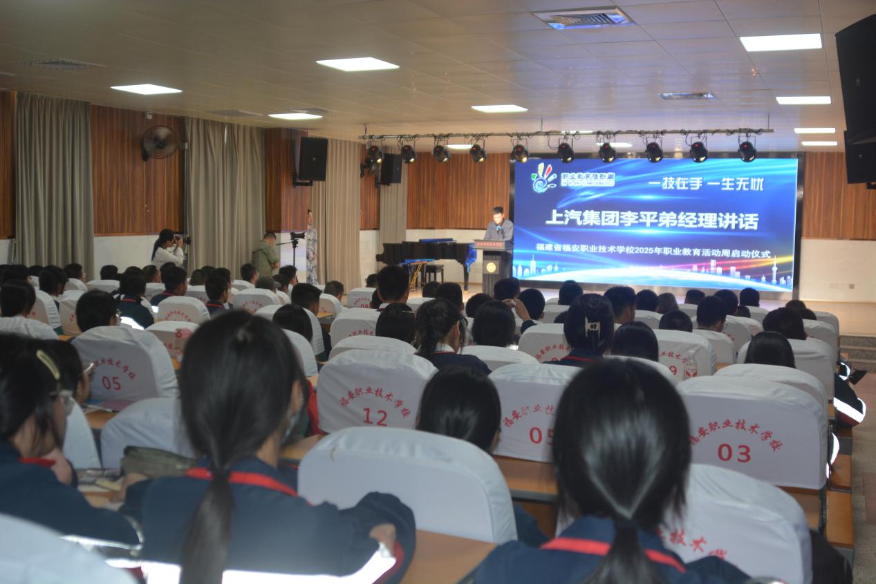 上汽集团福建分公司经理李平弟致辞,他回顾校企长期紧密合作,肯定学校输送的人才凭借扎实专业素养,在企业发挥重要作用。李平弟指出,汽车行业变革带来机遇,学校专业设置契合行业趋势,校企合作助力学生无缝对接岗位。他寄语学子珍惜学习机会,培养综合能力并坚持终身学习。同时表示,上汽福建分公司将深化合作,优化人才培养,拓展实习就业项目,携手为行业培育高素质人才,并预祝福安职校职教活动周圆满成功。