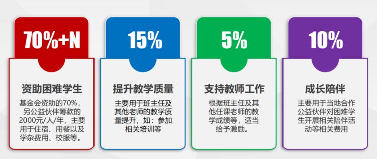 “1”是青山慈善基金会:每年资助25万(根据学生数量,以50名为准,每名5000元标准),其中,70%用于资助困难学生;20%用于老师教学水平和质量提升培训及激励;10%用于困难学生在学习期间的陪伴费用。